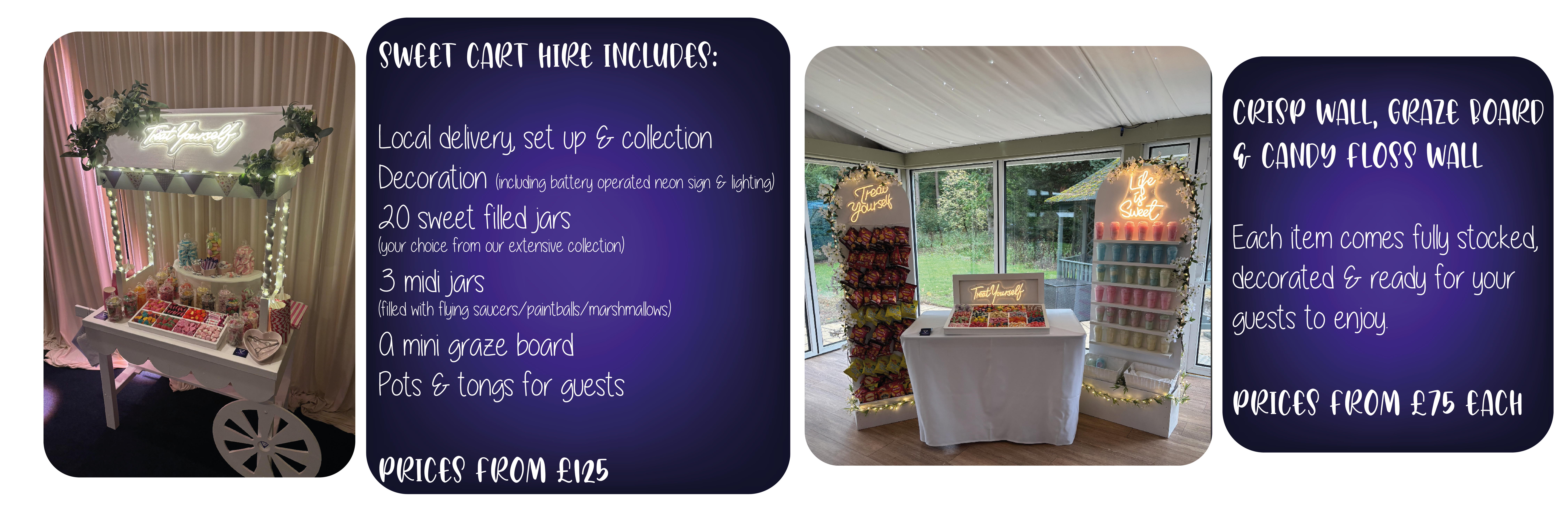 All of our carts come decorated to fit in with the event theme, with battery powered lighting, so they can look beautiful anywhere.